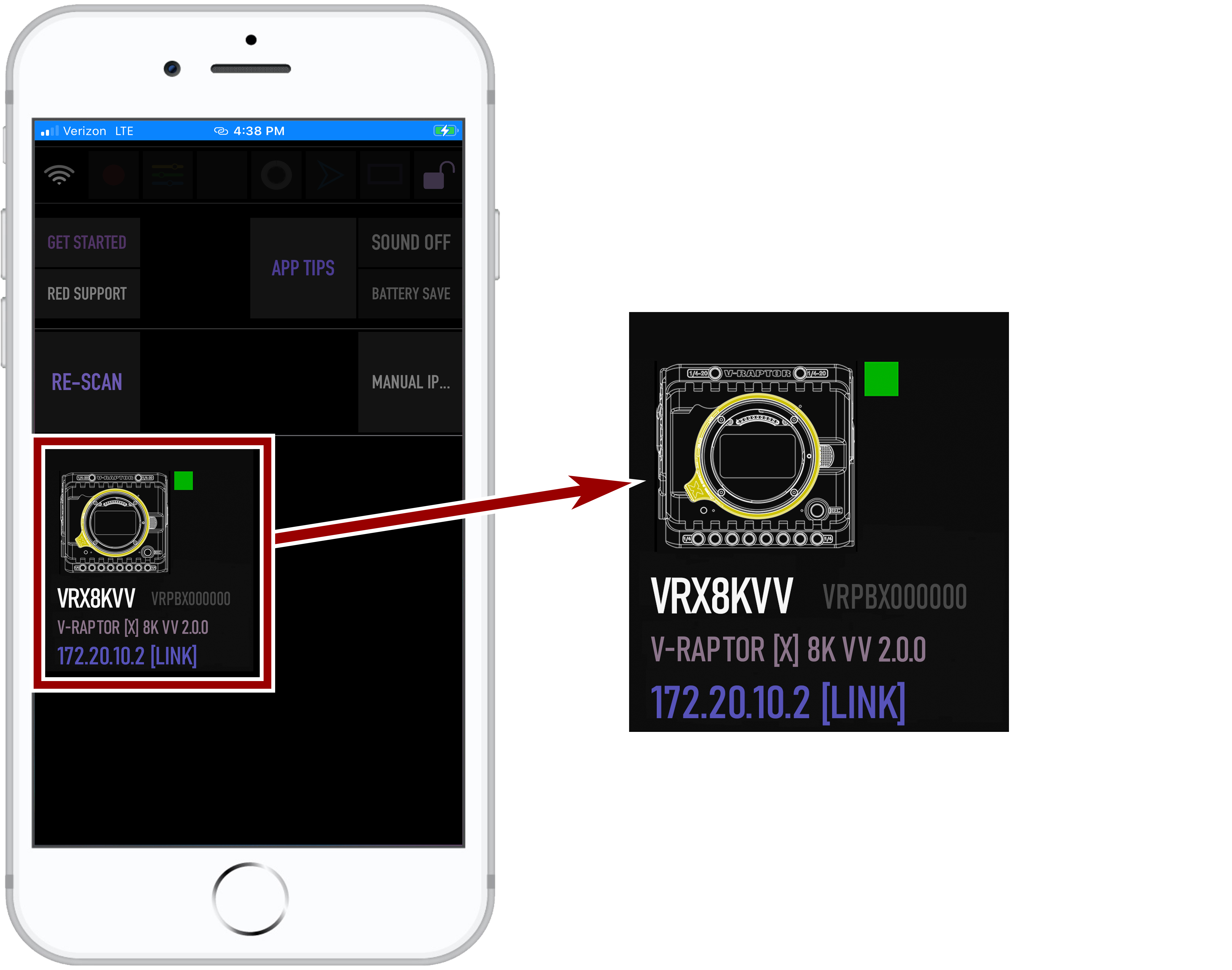 - Tap the icon to open the RED Control app tools for the connected camera.