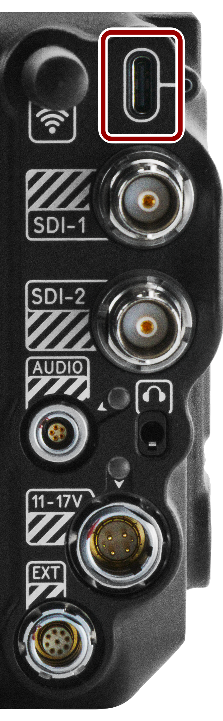 The USB-C port is used primarily for data connections. The USB-C port provides 5 volts at 0.5 amps. You can use a USB-C to 5 GbE adapter to connect an Ethernet cable to this port, along with a purchased RED Connect license, to supply output of up to 8K at 60p with minimal latency.