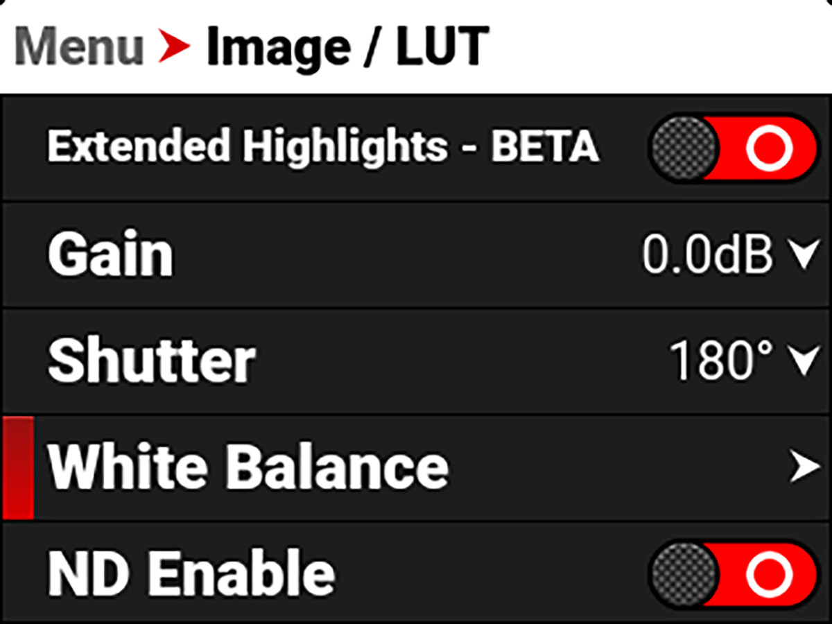 When shooting in R3D format, the camera stores white balance as metadata, which you can adjust non-destructively in post-production after filming.
