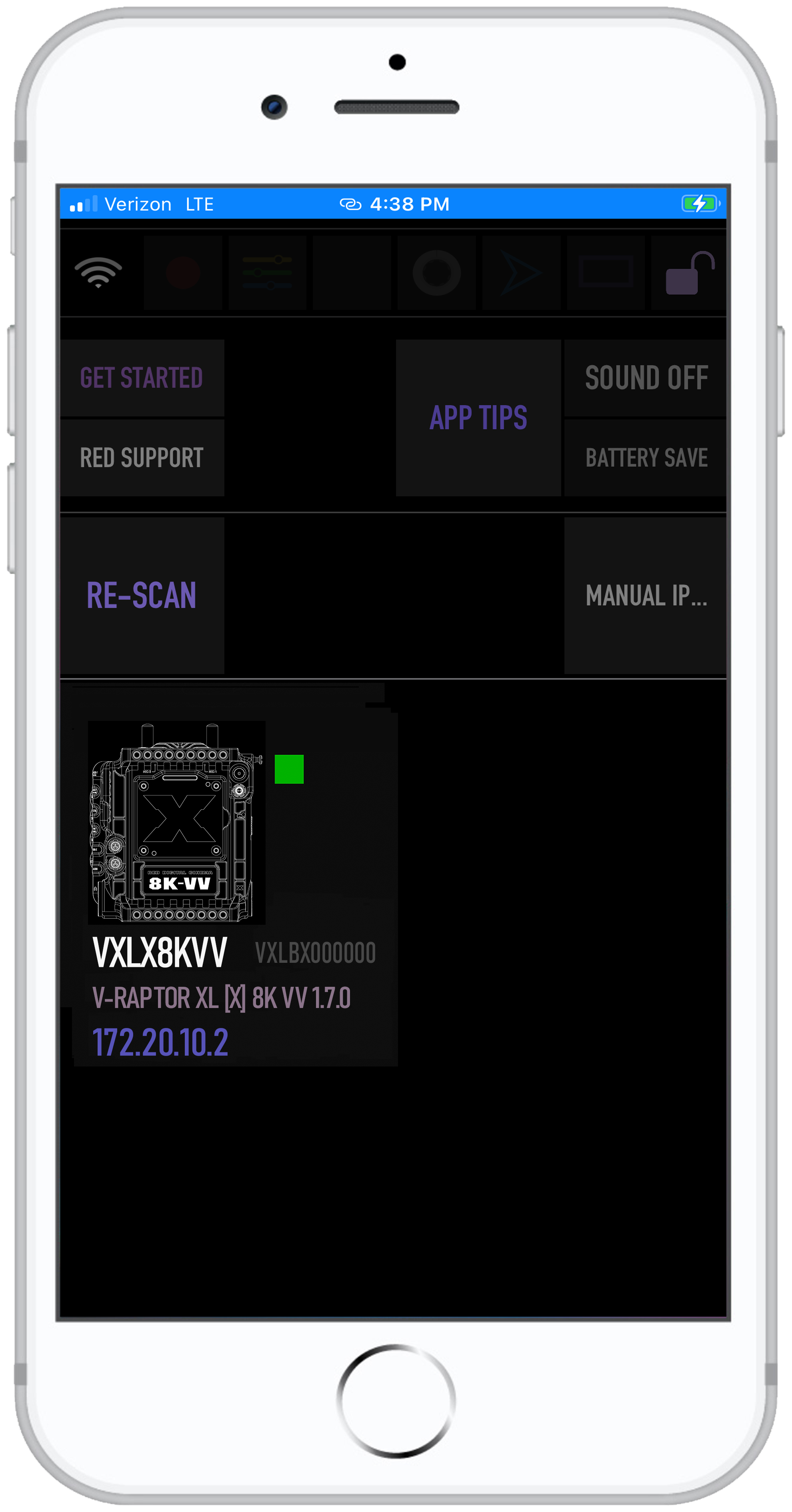 1. Tap the camera icon to open the RED Control app tools for the networked camera.