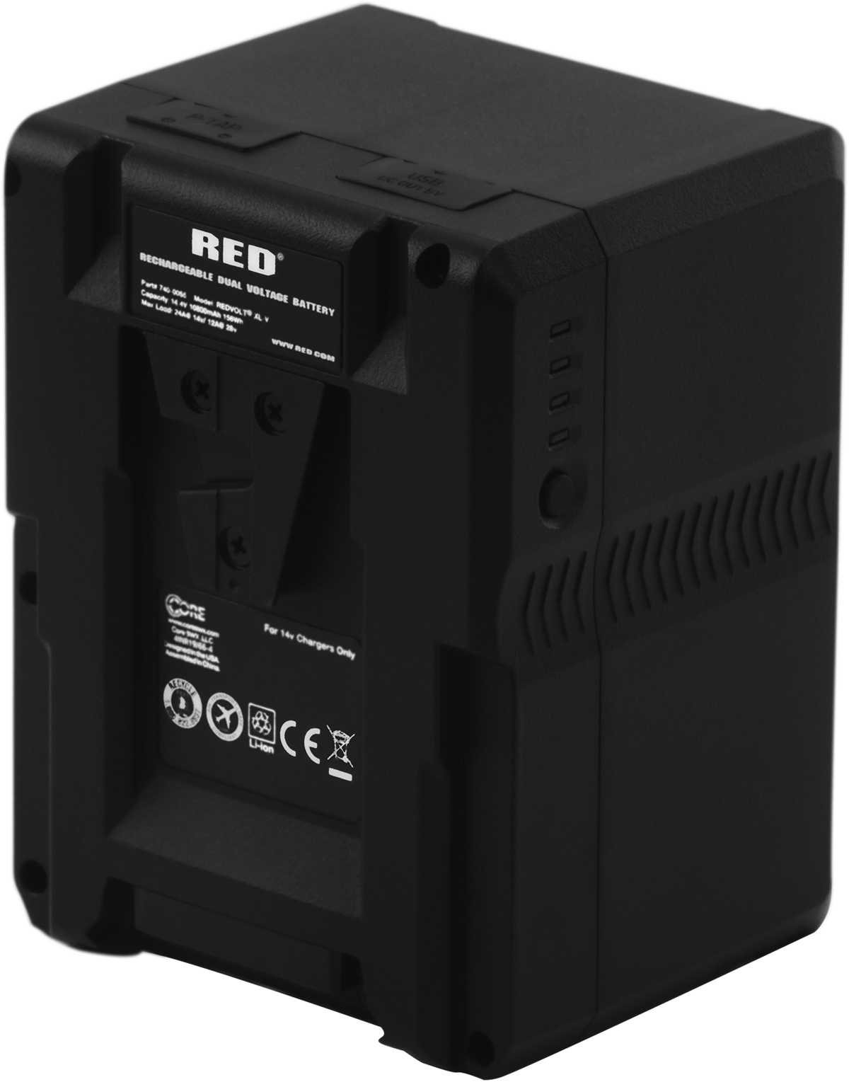 The REDVOLT® XL-V and XL-G are Native Dual Voltage™ batteries that can support both high voltage cameras such as the V-RAPTOR XL, and 14 V cameras such as the V-RAPTOR. This battery provides 156 Wh capacity, camera-aware automatic output switching between 14 V or 28 V, and it is capable of delivering up to 400 watts of power.