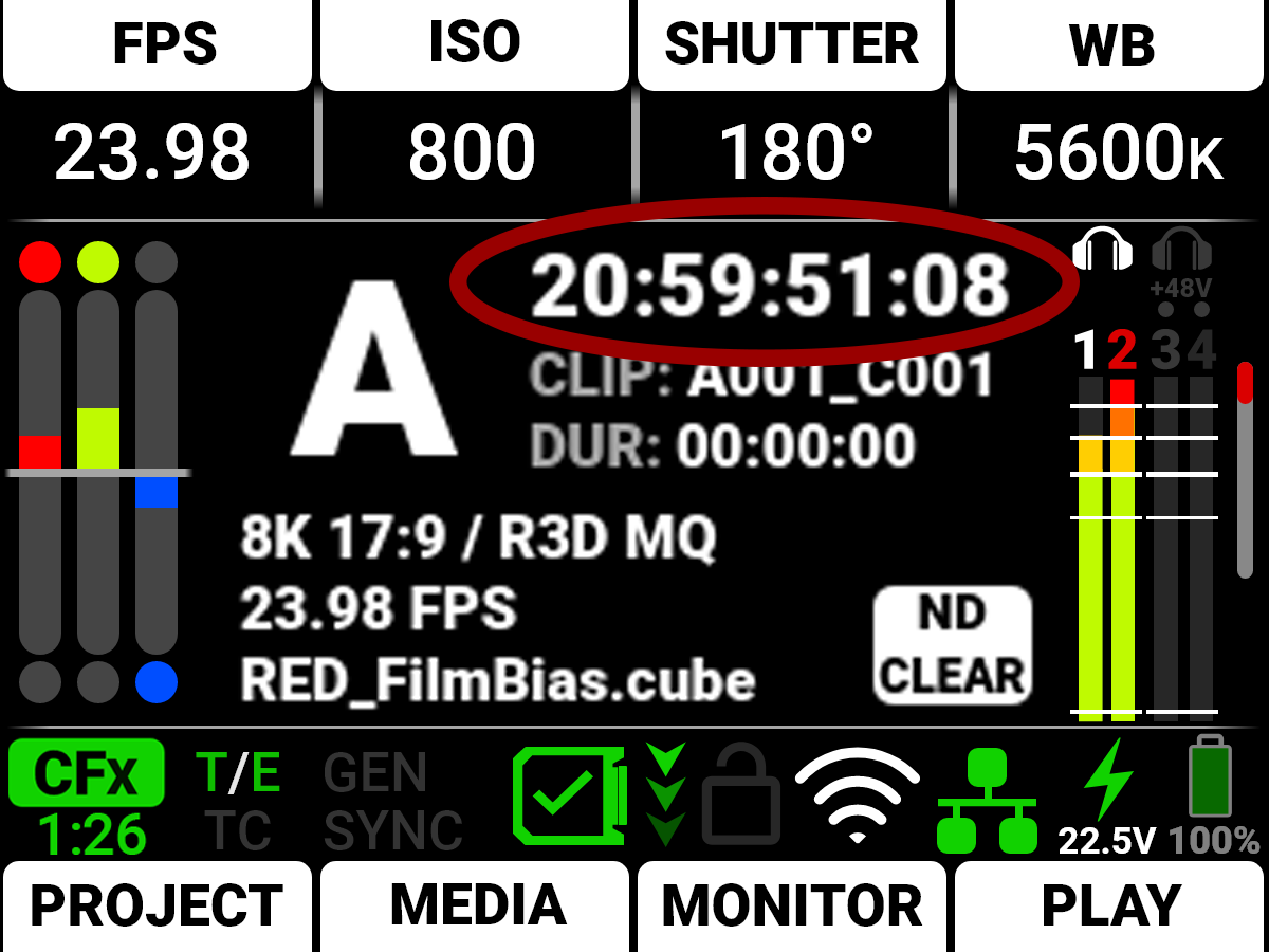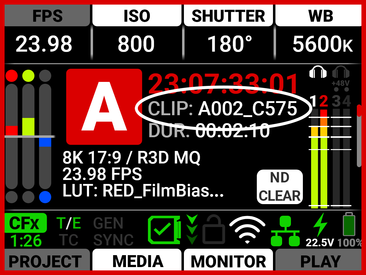 The Clip area displays either the currently recording clip name, or the upcoming clip name designated in the Project Settings menu (refer to Slate).