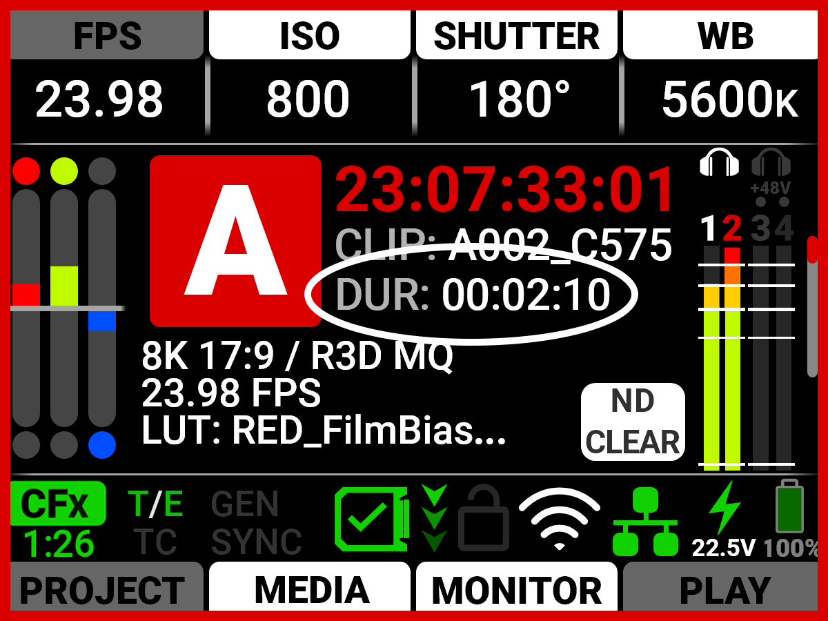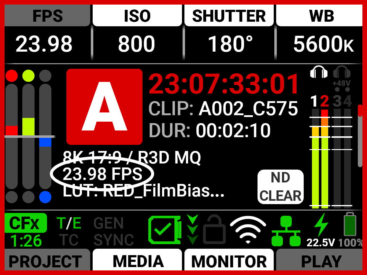 Pressing the button below Playback Rate allows you to toggle between playing the clip using the Project Time Base Rate (PRJ RATE), or using the Recording Frame Rate (REC RATE). The camera displays the current playback rate in bold.