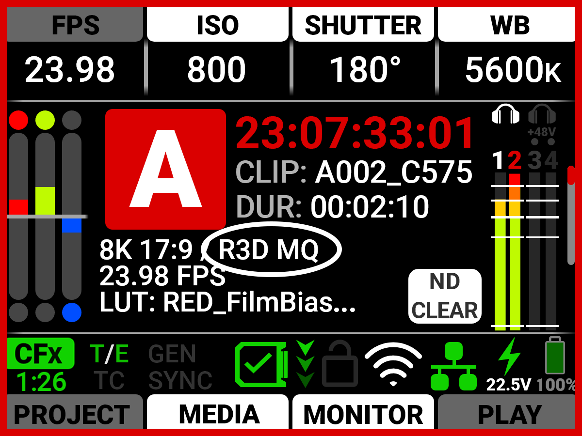 The Quality area displays the R3D or ProRes compression level (refer to R3D Quality).