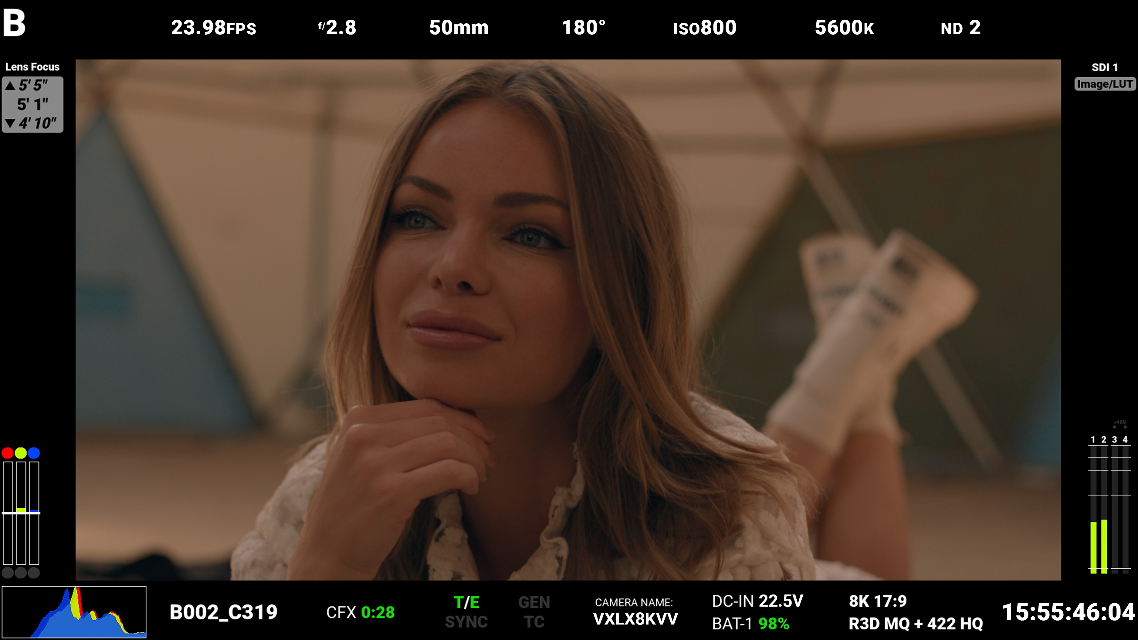 The camera saves the LUT applied here as a sidecar file alongside the R3D or ProRes file. The saved file uses the format sdi#_LUT Name.cube.