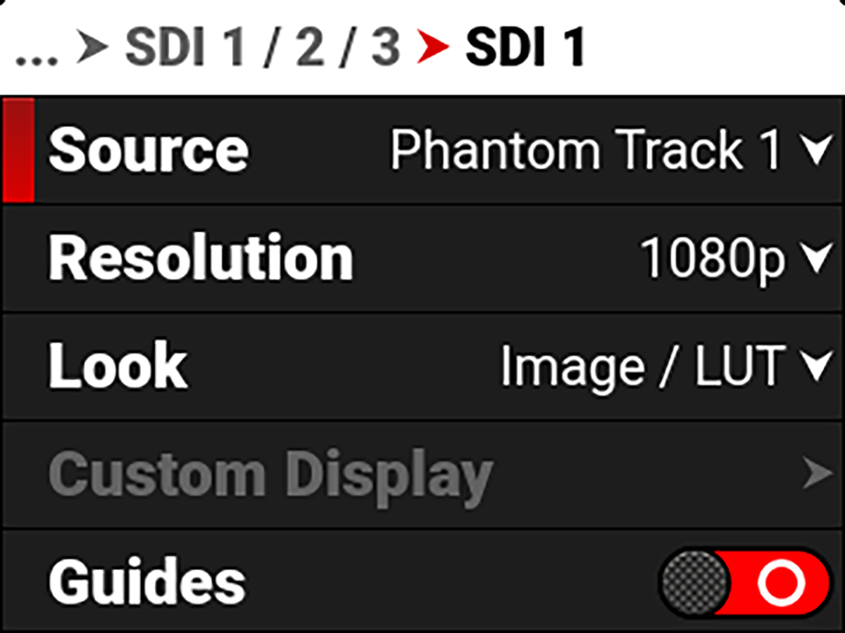 When you enable Phantom Track Recording mode in the Project Settings menu, the Source option is added to the SDI menu. You can use the Source option to select which Phantom track you want to display on the selected SDI port.
