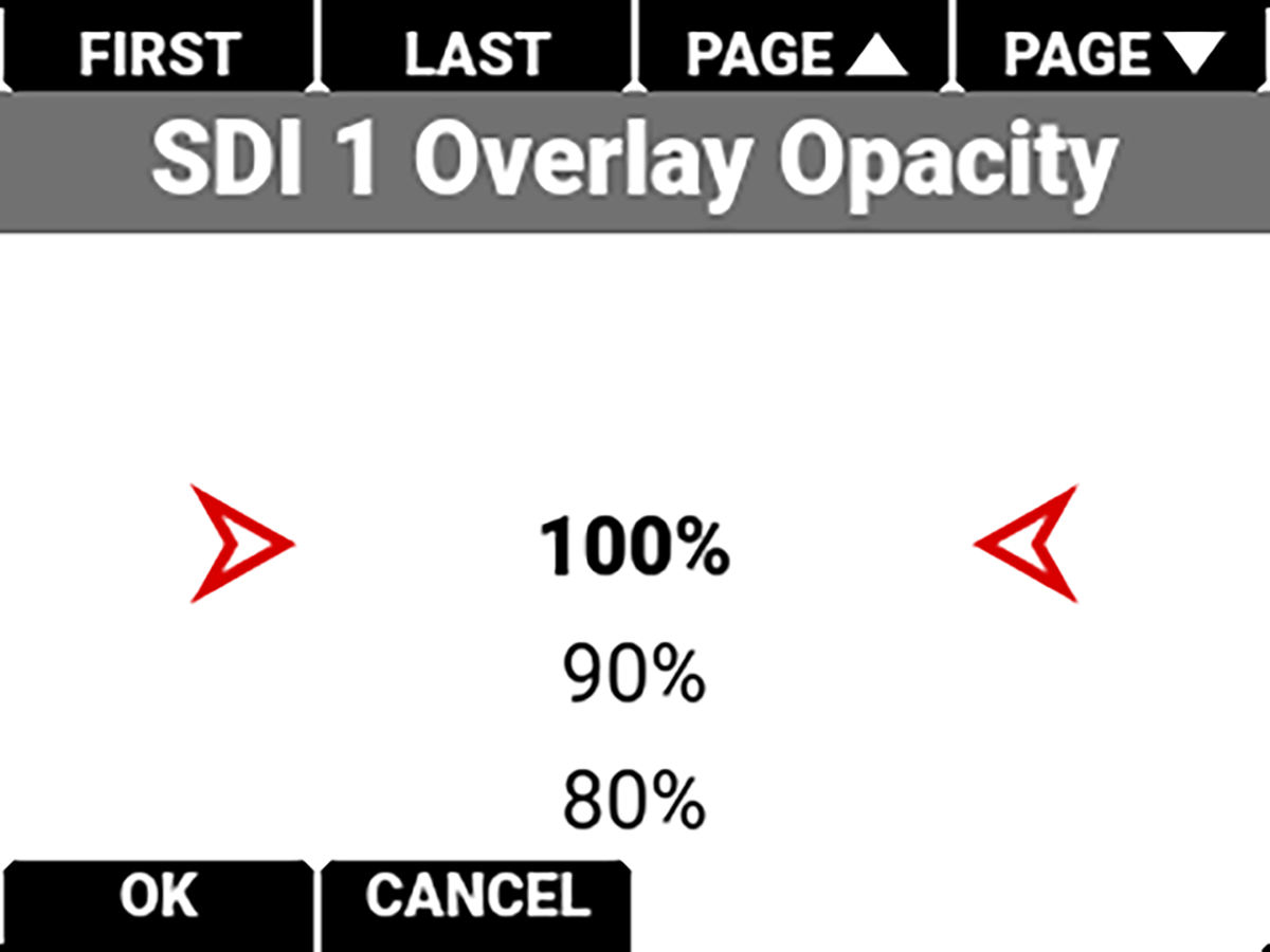 Use Overlay Opacity to select the percentage of opacity you want the overlay to display on the SDI output.