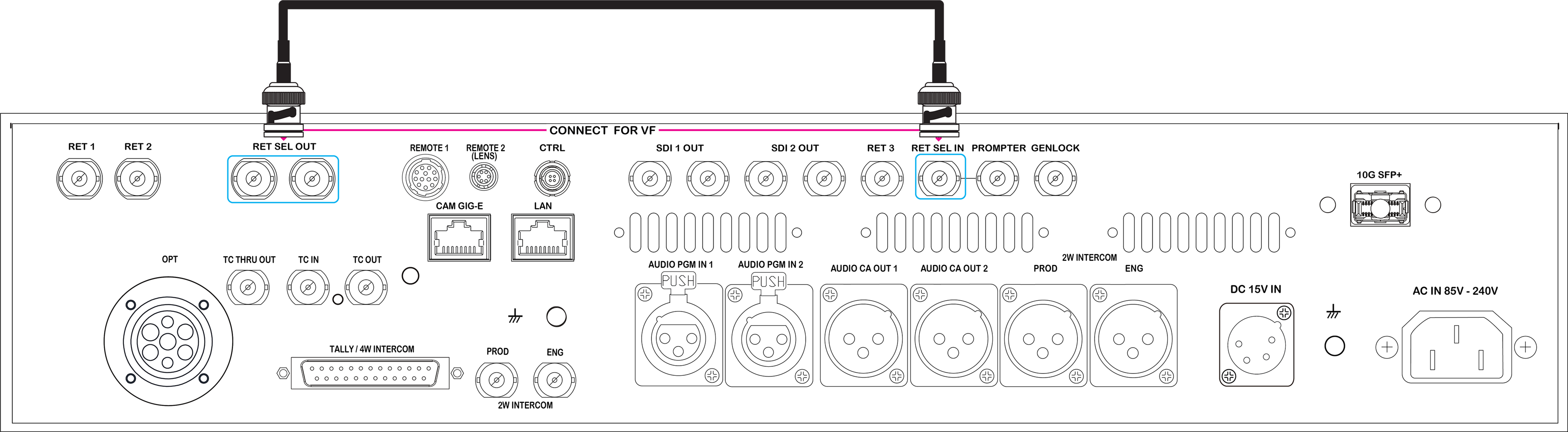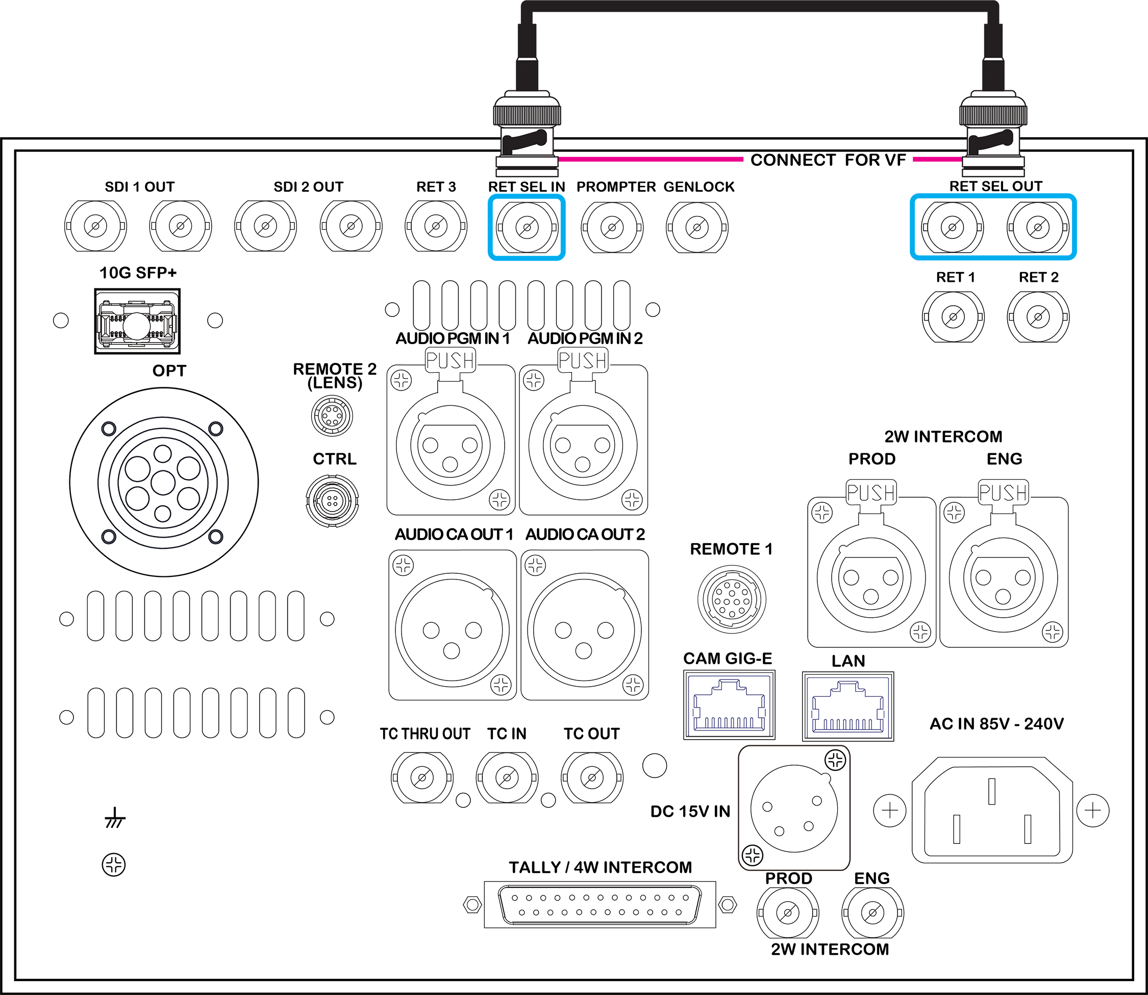 Connect RET SEL IN with one of the RET SEL OUTs by using the supplied BNC cable. This is required even when no return video is sent to the module.