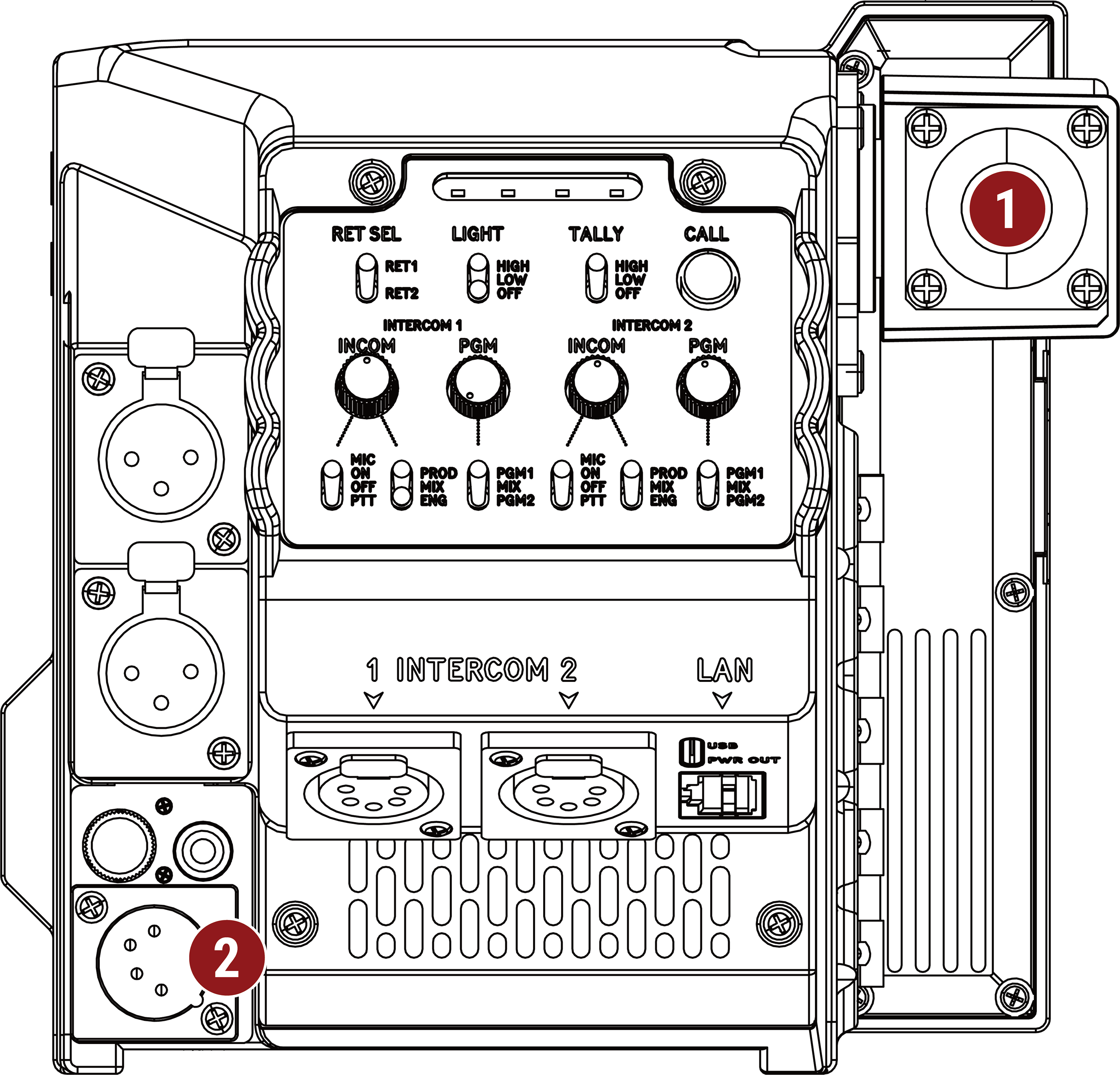 You must only power a Cine-Broadcast Module-equipped camera by using the module's OPT base station cable connection or the 4-Pin XLR DC-IN connection.