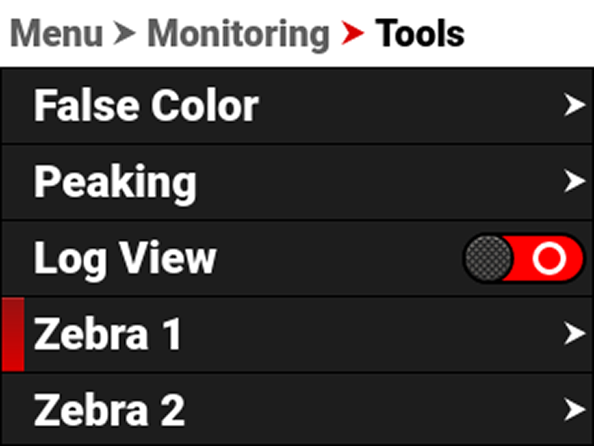 Use Zebra 1 to display one set of diagonal stripes to indicate highlight exposure levels. For more information, refer to Zebra Modes.