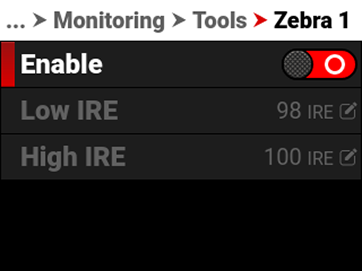 Enables red zebra stripes to indicate highlight exposure |