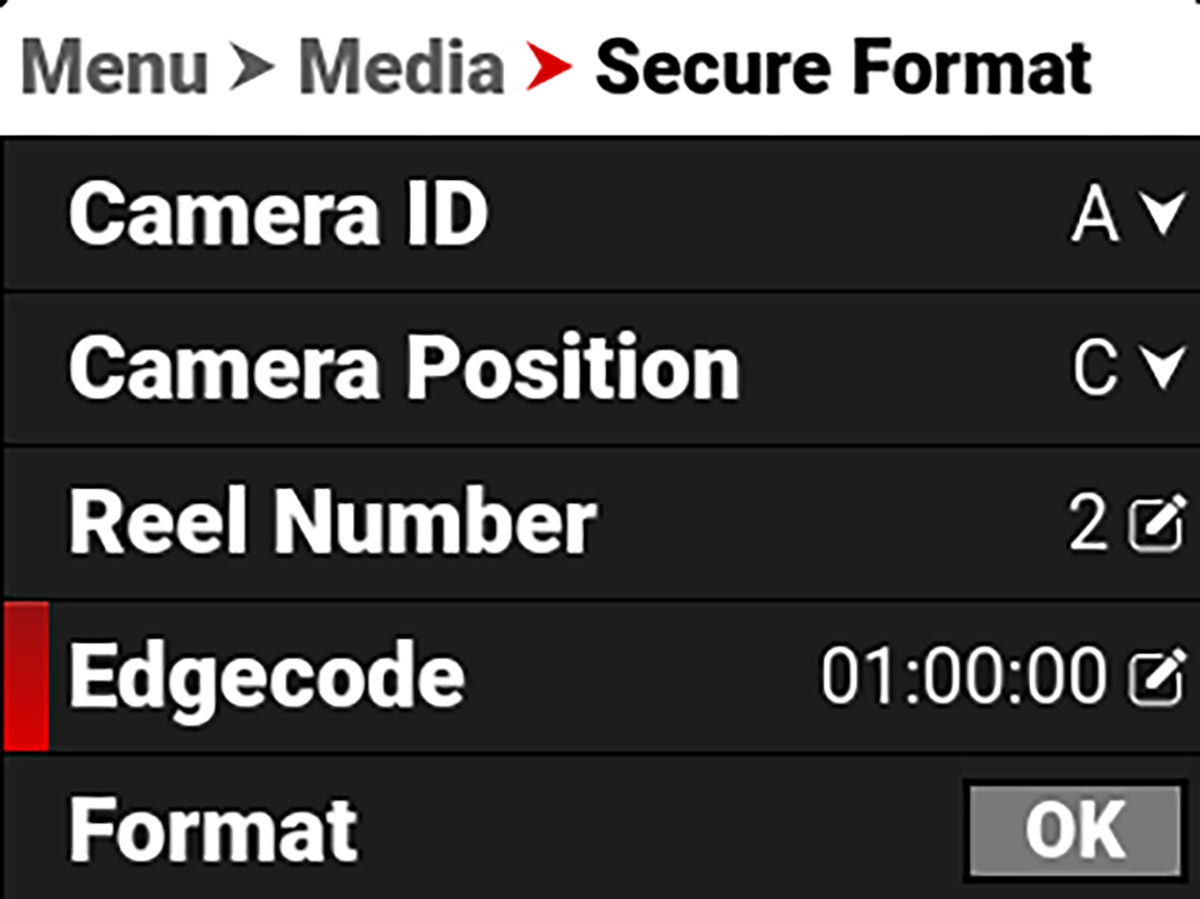Edgecode is a SMPTE Timecode track that by default starts at 01:00:00 on the first frame of each CFexpress media card. It is a sequential code that is continuous from frame to frame and also between clips. Edgecode is equivalent to RUN RECORD as used on broadcast cameras.