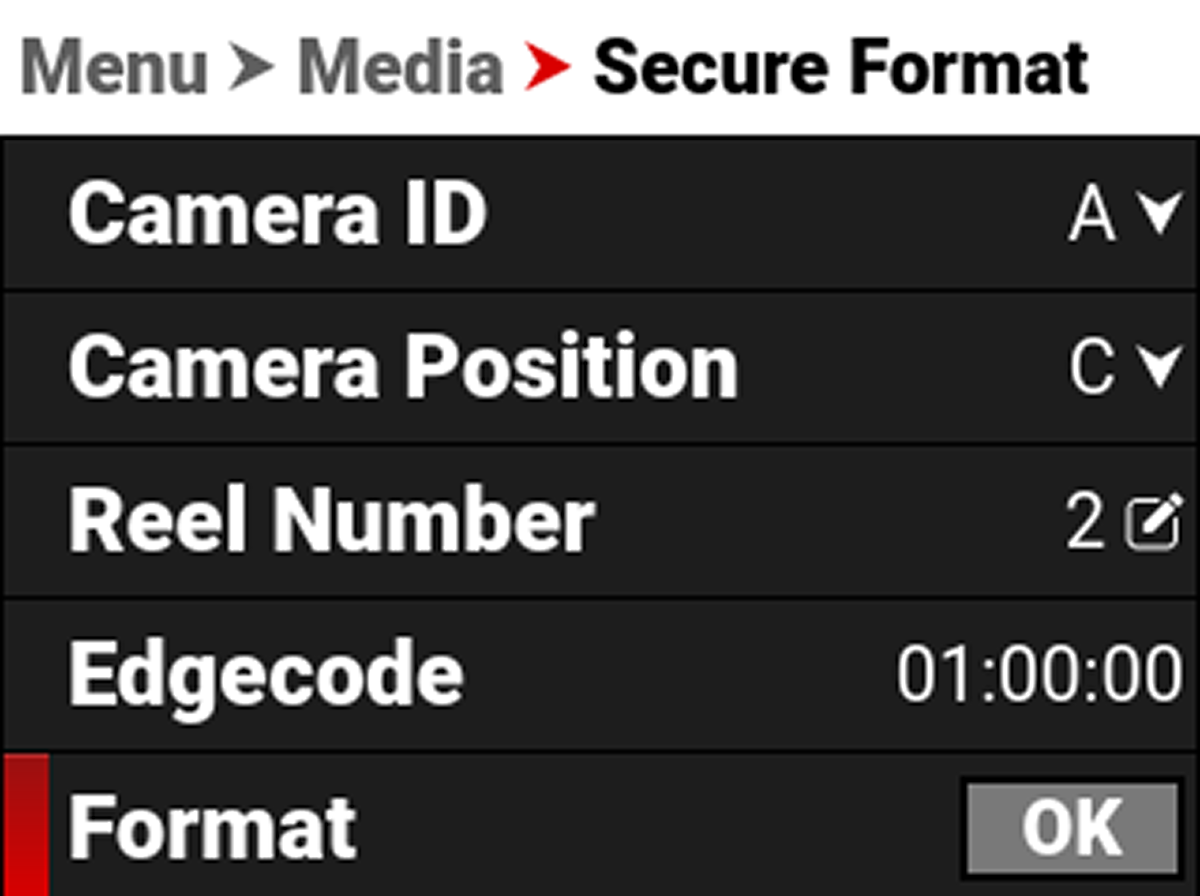 - From the Secure Format menu, select the desired Camera ID, Camera Position, Reel Number and Edgecode. Navigate down to the Format button and press SEL to start the Secure Format process: